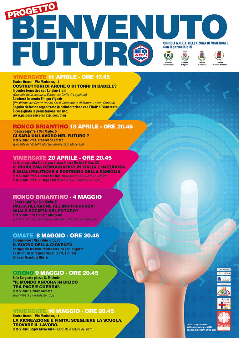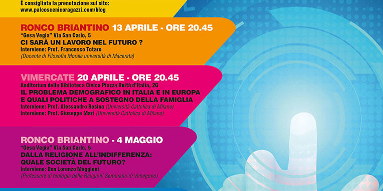 Si parte l’11 aprile con il primo appuntamento in programma: Costruttori di arche o di Torri di Babele? a Vimercate, per proseguire il 13 aprile con l’incontro Ci sarà un lavoro nel futuro? A Ronco Briantino. Terza tappa – sempre a Vimercate il 20 aprile – e terzo dibattito Il problema demografico in Italia e in Europa e quali politiche a sostegno della famiglia; proseguendo ancora a Ronco il 4 maggio con l’incontro Dalla religione all’indifferenza: quale società del futuro? A Omate e Oreno, l’8 e 9 maggio, si parla del Sogno della gioventù e de Il mondo ancora in bilico tra pace e guerra e si conclude di nuovo a Vimercate il 16 maggio con La ricreazione è finita: scegliere la scuola, trovare il lavoro.